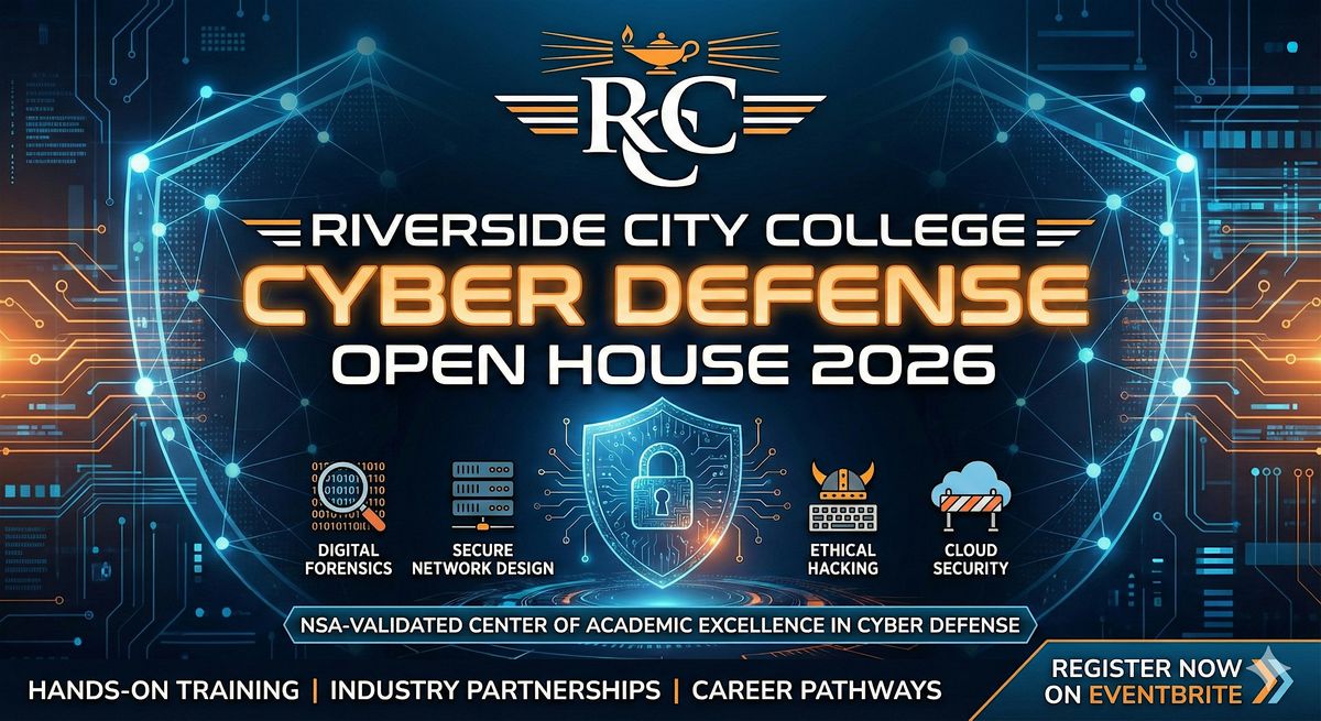 Please join us on Fri Jan 9, 2026 at 6:00 PM at Riverside City College, Business, Law and Computer Information Systems building. Come and learn about our cutting-edge cybersecurity program, meet with faculty members, explore our state-of-the-art facilities, see interactive student projects, and particpate ina capture the flag event. Whether you're a current student interested in cybersecurity or someone looking to start a new career in this exciting field, this event is perfect for you. Don't miss this opportunity to take the first step towards a successful career in cybersecurity!