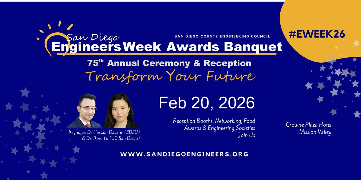 Come join us for the 2026 San Diego Engineers Week Awards Banquet! This exciting event will be held at the Crowne Plaza Hotel in Mission Valley. It's time to celebrate the inspirational keynotes and brilliant achievements of our local engineers!