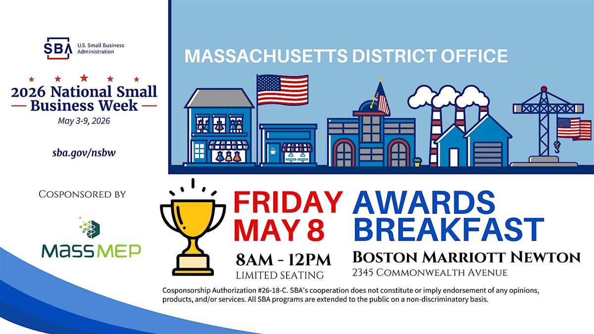 The SBA Massachusetts District Office will celebrate National Small Business Week with our Annual Awards Breakfast at the Boston Marriott Newton on Friday, May 8th, 2026.