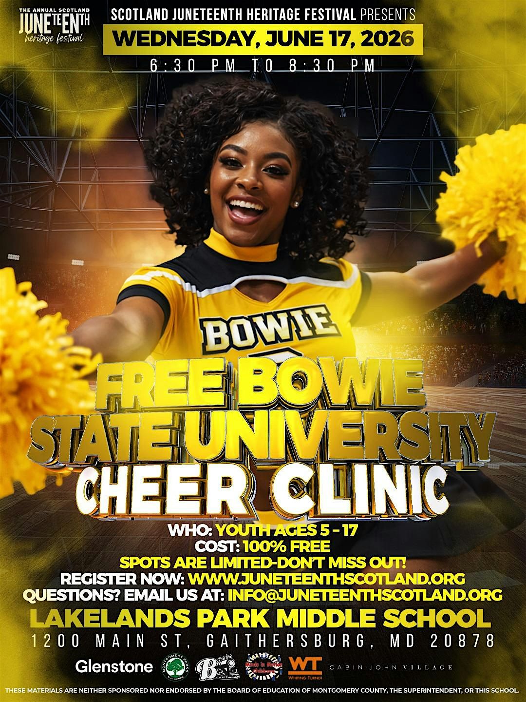 Join us for an unforgettable evening of movement, confidence, and spirit at the Scotland Juneteenth Heritage Festival’s Cheer Clinic - led by the Bowie State University Cheer Team!