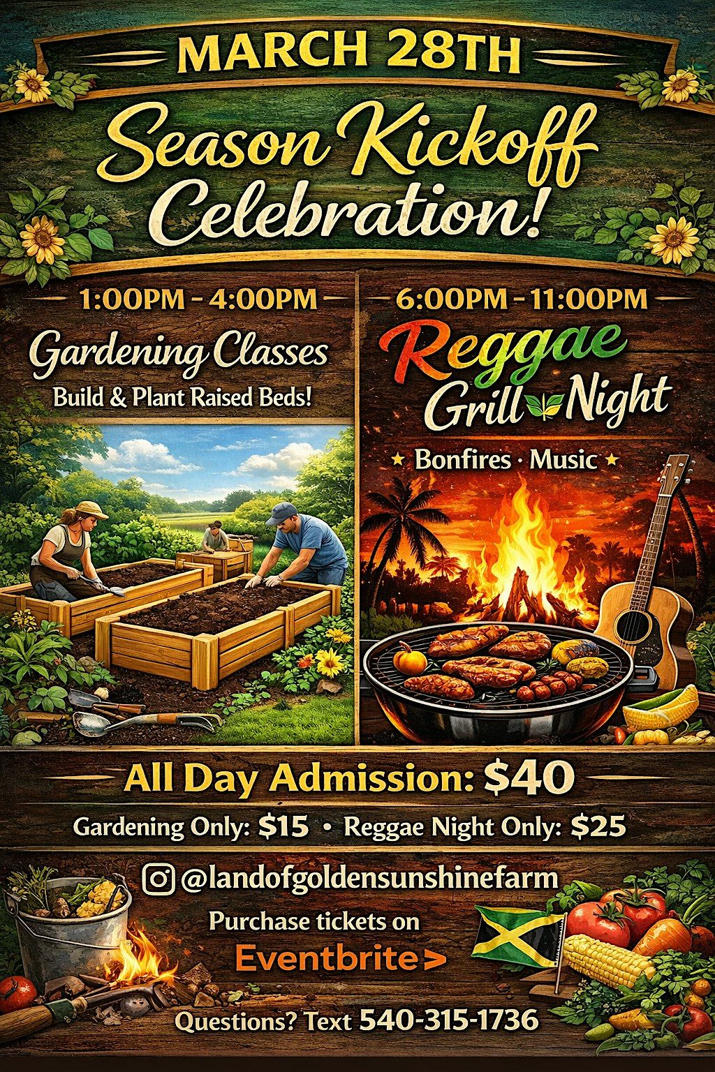 Kick off spring at Land of Golden Sunshine Farm! Gardening class, reggae grill night, bonfires, food & music. March 28 in Stafford VA