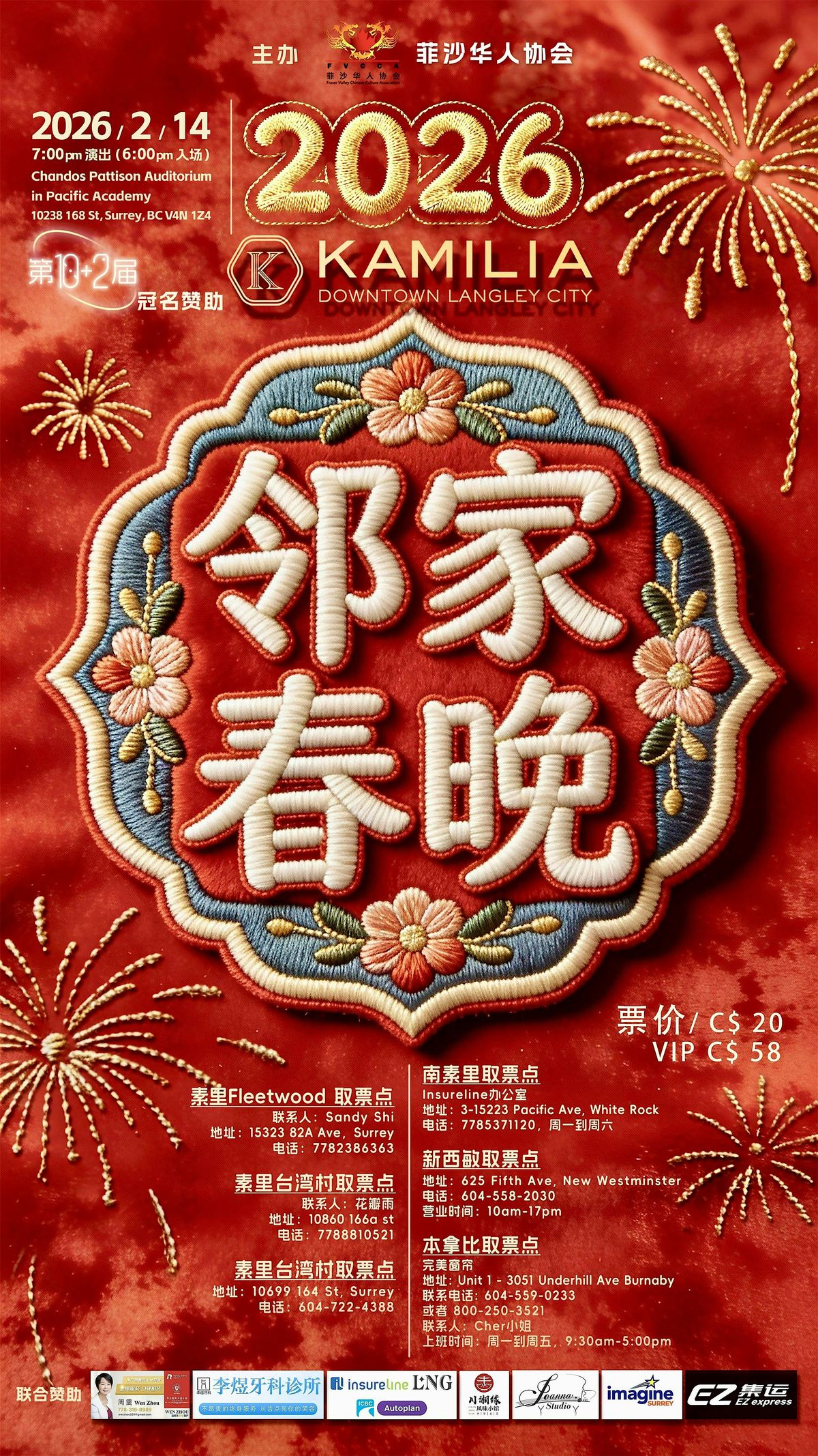 Join us for the 2026 Spring Festival Gala, proudly presented by the Fraser Valley Chinese Culture Association. Now in its 12th year, this signature annual event has welcomed over 1,500 audience members each year and is expected to be a full house once again. The gala features more than 12 outstanding cultural performances, with a strong focus on Chinese cultural arts, alongside Indigenous Indian dance, Indian dance, and other exciting and diverse performances. Celebrate the Lunar New Year with an evening of culture, community, and spectacular entertainment that brings people together through tradition and diversity.