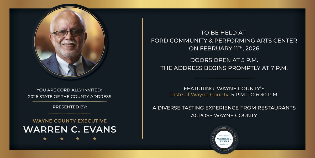 Wayne County Executive Warren C. Evans cordially invites you to the 2026 State of the County Address on Wednesday February 11, 2026. This in-person event is a great opportunity to learn about the county's achievements, progress, future plans and engage with fellow community members.