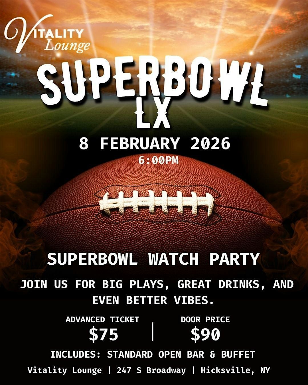Super Bowl Watch Party at Vitality Lounge! 6pm. $75 advance/$90 door. Open bar & buffet all game. Exclusions apply.About this Event