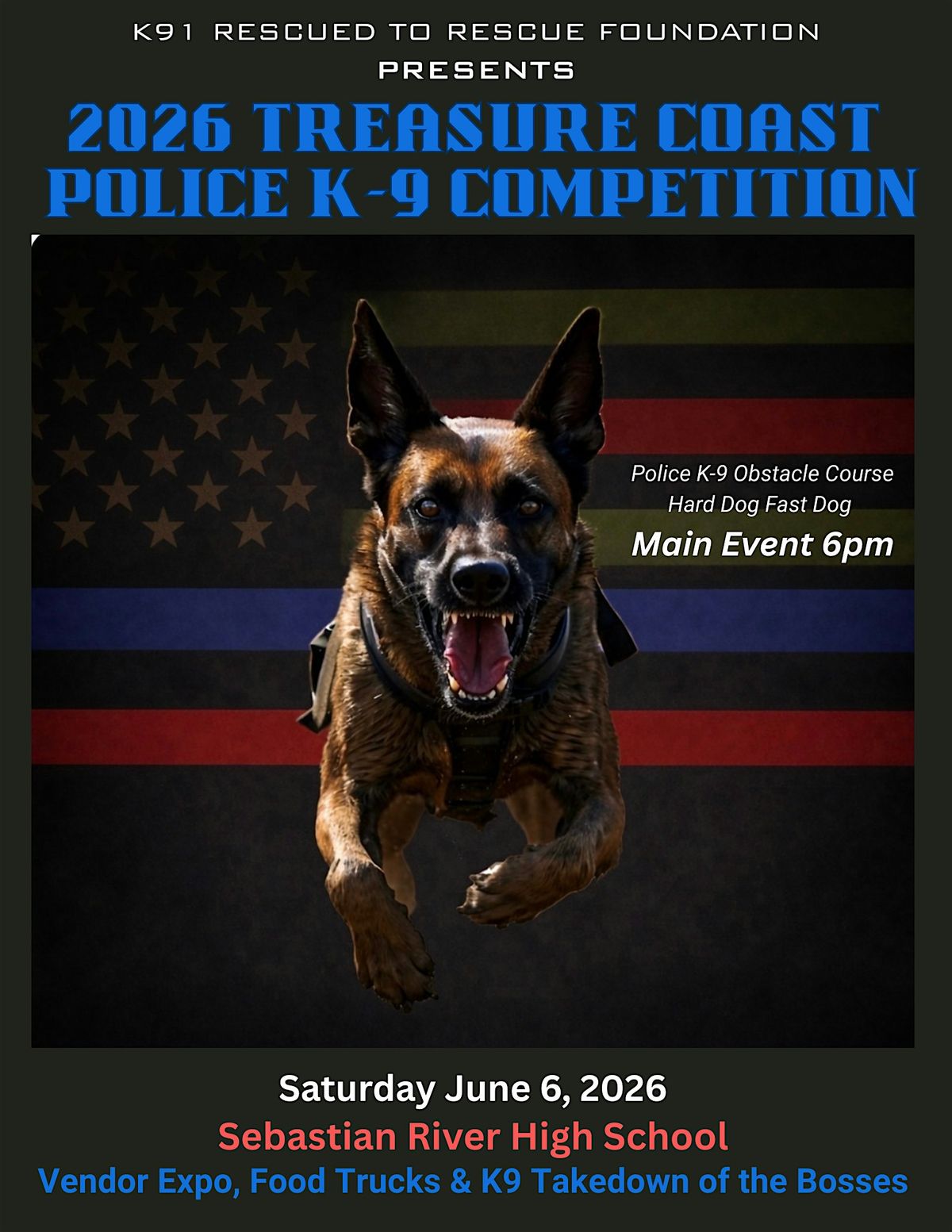 All proceeds from the Treasure Coast K-9 Competition benefit the K9 1 Rescued to Rescue Foundation, supporting the rescue of shelter dogs and their professional training as therapy and service dogs for veterans and first responders battling trauma. In addition, sponsorship funds provide vital support to local law enforcement K-9 agencies, helping cover training, equipment, and ongoing care to keep their teams mission-ready.
