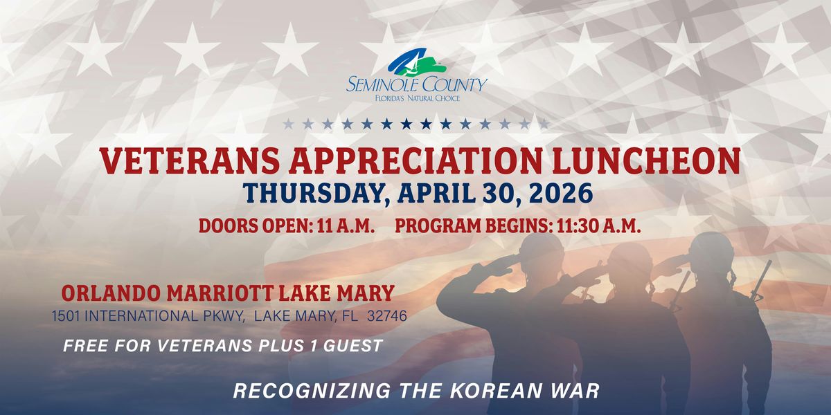 Seminole County and its partners cordially invite all veteran residents to an appreciation luncheon as a gesture of respect and gratitude for their service in the United States Armed Forces. This event is provided free of charge to veterans, and each veteran is welcome to bring one (1) complimentary guest. This year's theme is Recognizing the Korean War.