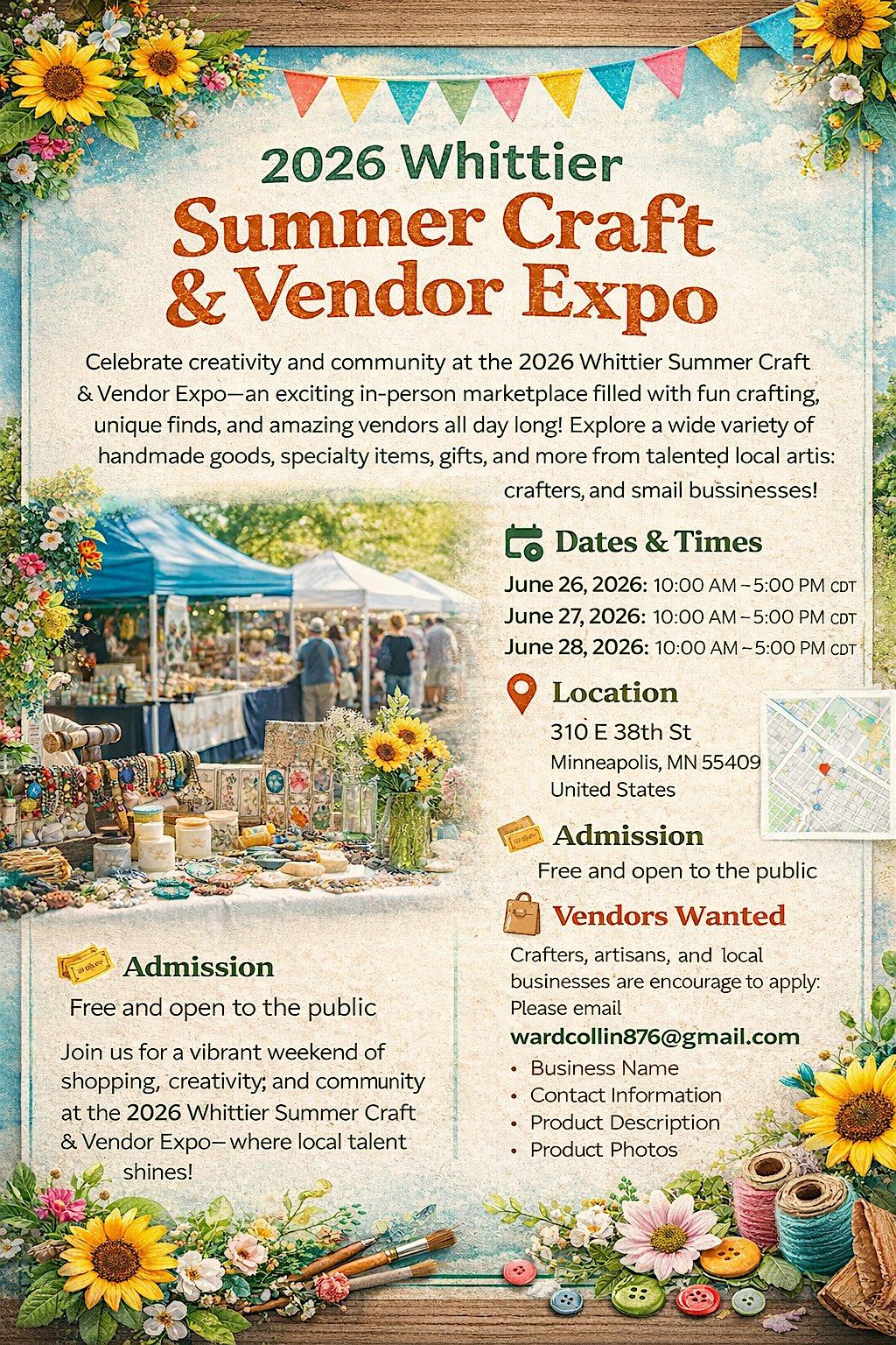Join us for a vibrant weekend of shopping, creativity, and community at the 2026 Whittier Summer Craft & Vendor Expo—where local talent shines!