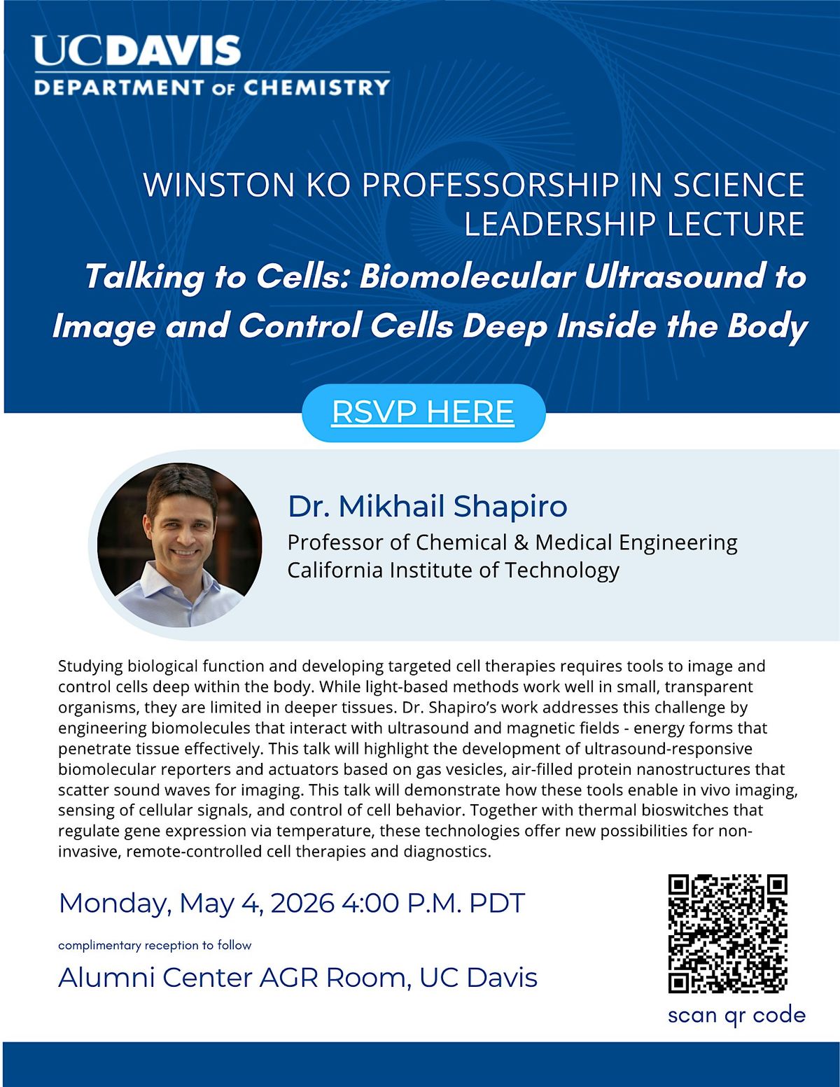 Studying biological function and developing targeted cell therapies requires tools to image and control cells deep within the body. While light-based methods work well in small, transparent organisms, they are limited in deeper tissues. Dr. Shapiro’s work addresses this challenge by engineering biomolecules that interact with ultrasound and magnetic fields - energy forms that penetrate tissue effectively. This talk will highlight the development of ultrasound-responsive biomolecular reporters and actuators based on gas vesicles, air-filled protein nanostructures that scatter sound waves for imaging. This talk will demonstrate how these tools enable in vivo imaging, sensing of cellular signals, and control of cell behavior. Together with thermal bioswitches that regulate gene expression via temperature, these technologies offer new possibilities for non-invasive, remote-controlled cell therapies and diagnostics.