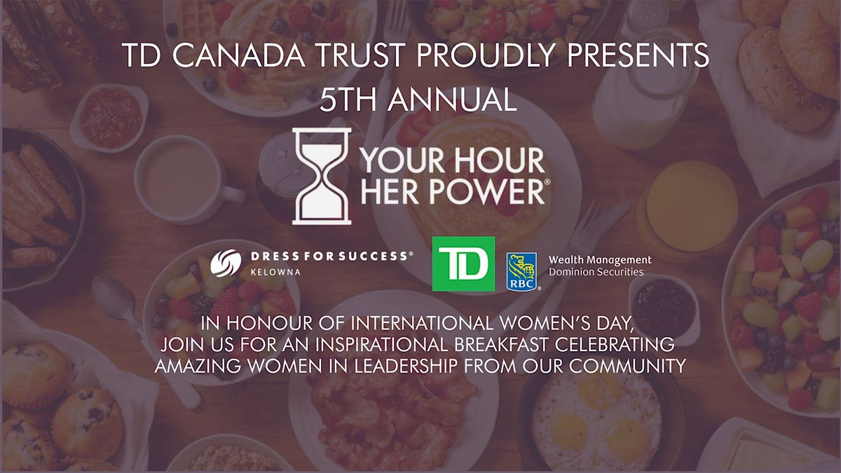 Join us for the 5th Annual Your Hour, Her Power Speakers Panel & Fundraiser Breakfast, presented by TD Canada Trust, with RBC Dominion Securities as Breakfast Sponsor. This year’s panel will be moderated by Kelowna City Councillor Loyal Wooldridge.
