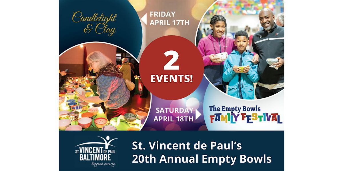 You’re invited to celebrate the 20th Annual Empty Bowls with two unforgettable events over one weekend that bring our community together around a shared mission. Start the weekend of April 17 off with Candlelight & Clay, an elegant evening of music and fine food that friends and donors of St. Vincent de Paul of Baltimore won’t want to miss. Then, experience an event for families, friends, and foodies alike on April 18—the Empty Bowls Family Festival, filled with unlimited soup, fun, and kid-friendly entertainment.