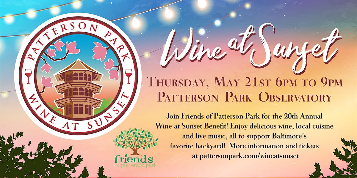 Join the Friends of Patterson Park at the Patterson Park Observatory for the 20th Annual Patterson Park Wine at Sunset Benefit, hosted by Danny and Michele Barnycz. The event will take place Thursday, May 21, 2026 from 6pm to 9pm. Each ticket includes unlimited wine tastings, small bites from several local restaurants, and live music by Rob Fahey.