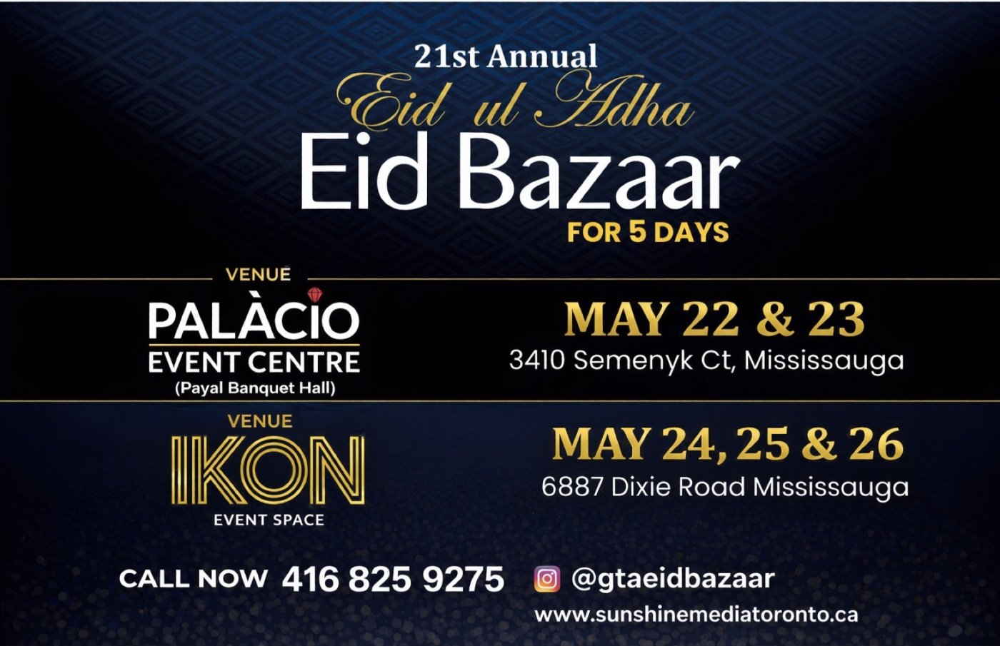 21st Annual Eid Bazaar on May 22 & 23 @ Palacio Event Space & On May 24 25 26 @ IKON Event Space