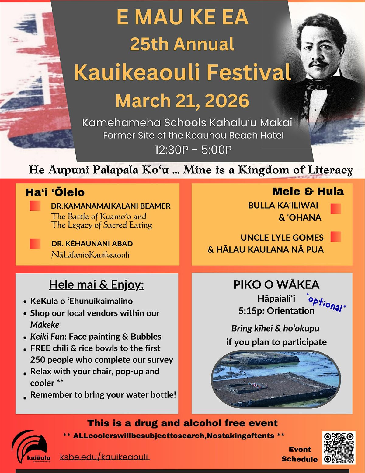 E Hele Mai! Come! Celebrate the 25th Annual Ka Lani Kauikeaouli Festival at Kamehameha Schools Kahaluʻu MakaiAbout this Event