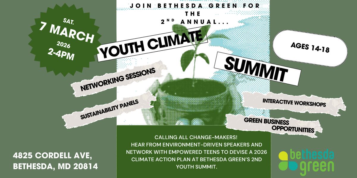 Calling all high school changemakers! Join us for the 2nd Annual Youth Climate Summit on Saturday, March 7, 2025, from 2-4 PM at Bethesda Green. Connect with passionate students from across Montgomery County to learn, collaborate, and lead climate action in your community!