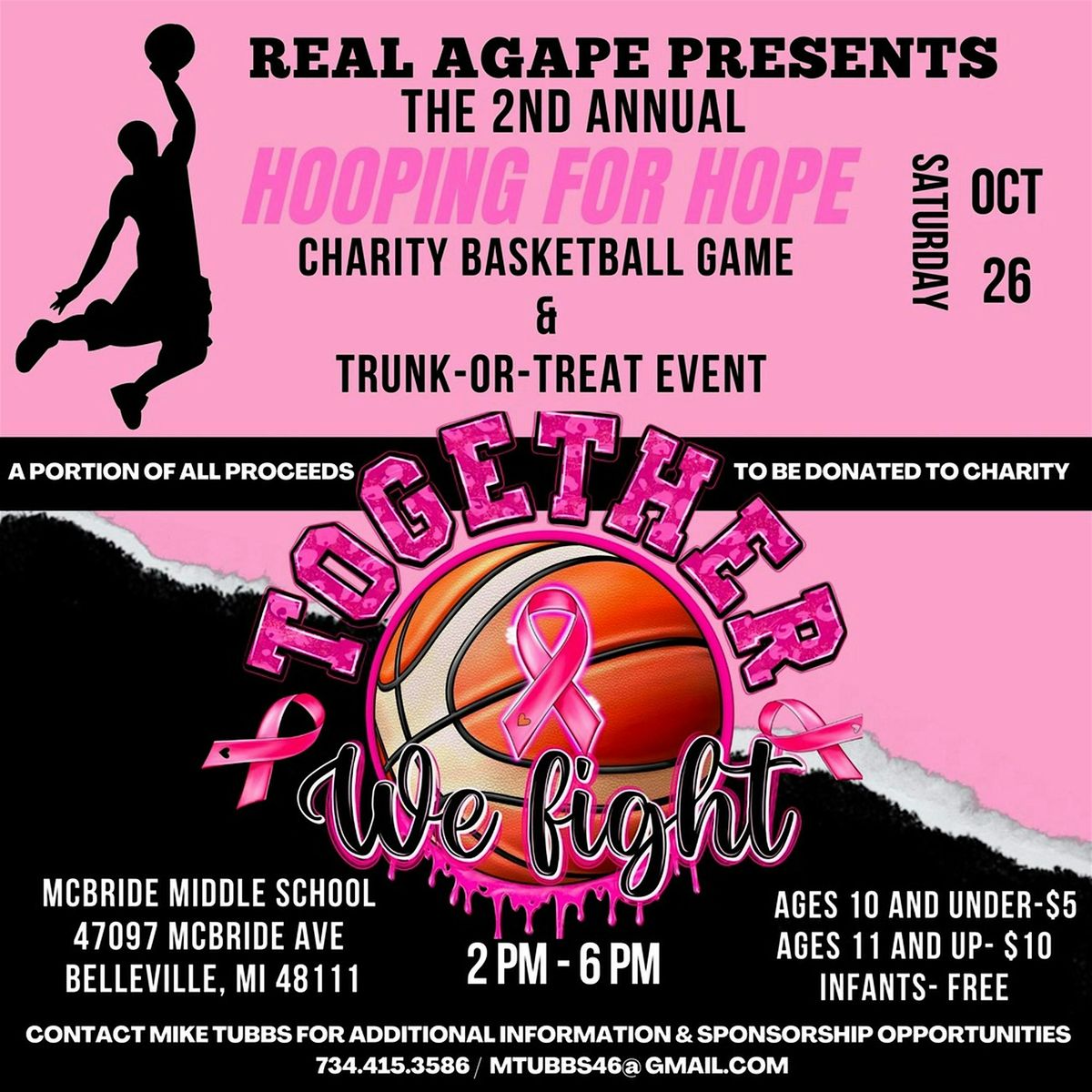 Join us at McBride Middle School on Sat, Oct 26, 2024 at 2:00 PM as we unite to fight breast cancer! This exciting event will feature a thrilling basketball game, trunk-or-treat, and delicious food and drinks.