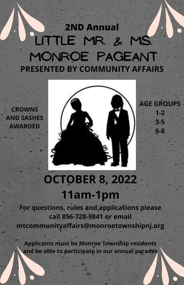 We invite your little ones to come out and show us their true personalities. there will be 2 categories, formal wear and costume. The age groups are 1-2, 3-5 and 6-8 year old children. All applicants must be registered by Sept. 9th. Late applications will not be accepted. If you are interested please email [email protected] for rules and applications or click the links below for applications and rules page both must be filled out to register:https://monroetownshipnj.org/wp-content/uploads/2022/06/Little-Mr.-Ms.-Monroe-Pageant-Application.pdf