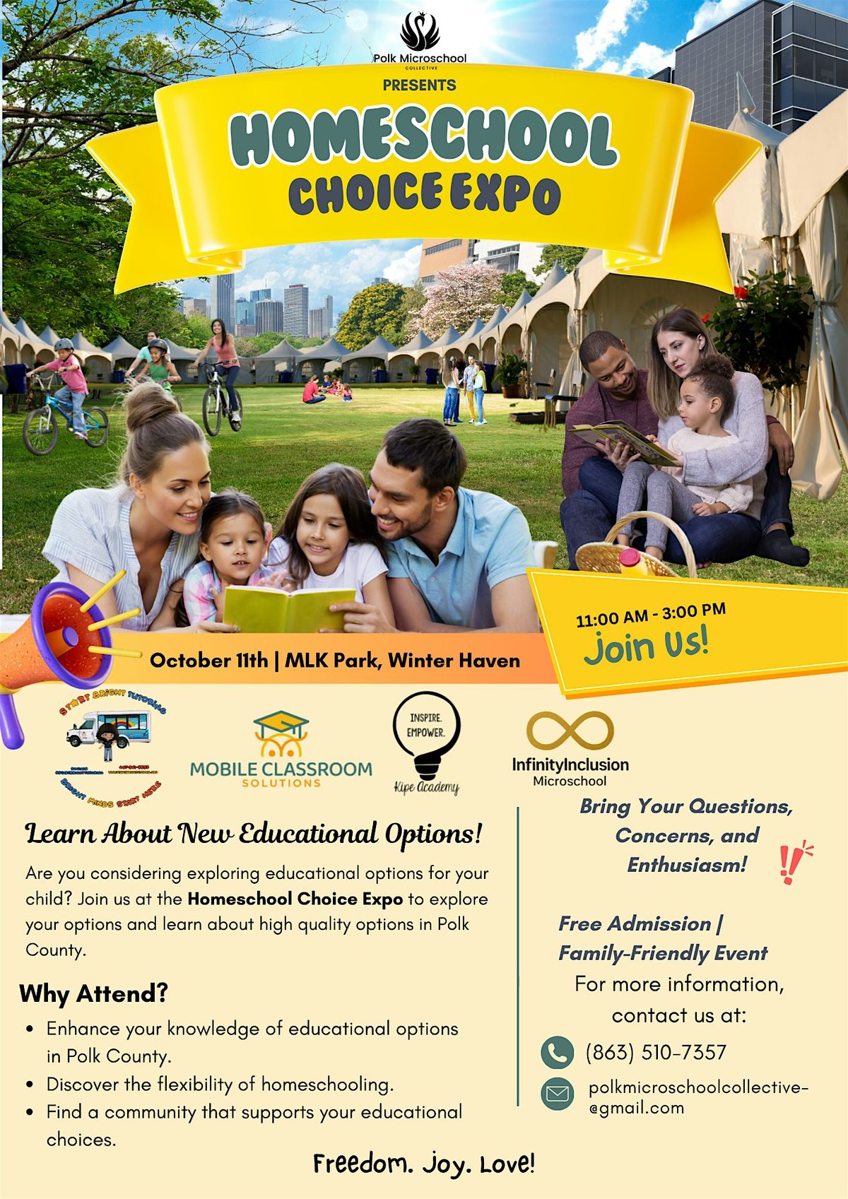 Join us at MLK Park on Lake Silver for the 2nd Annual Polk County Homeschool Choice Expo hosted by Mobile Classroom Solutions, Kipe Academy, Start Bright Tutoring, and Infinity Inclusion Microschool—together as The Polk County Microschool Collective.