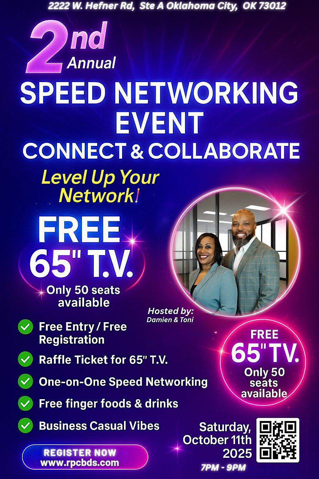 Join us on Saturday, October 11th, 2025, from 7:00 PM to 9:00 PM at 2222 W Hefner Rd, Suite A, Oklahoma City, OK 73120, for an exciting evening of networking, connection, and opportunity unlike any other event at the RPC Business Development Services Business Mixer & Speed Networking Event. This event is designed to bring entrepreneurs, business professionals, and aspiring business owners together in a relaxed and engaging environment. Guests will enjoy free finger foods and drinks while participating in structured speed networking sessions and building meaningful relationships with individuals who may be able to assist with or elevate their business goals.Business casual attire is required, so come dressed to make a professional impression. All attendees who register in advance will be automatically entered into our raffle giveaway, with a chance to win great prizes throughout the evening. One lucky winner will take home our grand prize- a 65" Smart TV! Please note, you must register and be present no later than 8:00 PM to be eligible for any raffle prize.Whether you're looking to grow your business, share your ideas, or meet like-minded professionals, this is an event you won't want to miss!