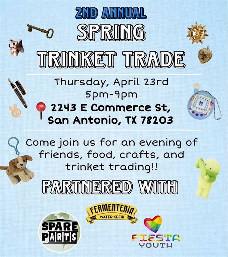 Join us for an evening of friends, food, and trinket trading! In partnership with Spare Parts and Fiesta Youth, we are taking over Fermenteria to give you our 2nd Annual Spring Trinket Trade! Bring your little things, your crafts, and yourself and meet fellow trinketeers and lovers of tchotchkes! All folks and furry friends are welcome!