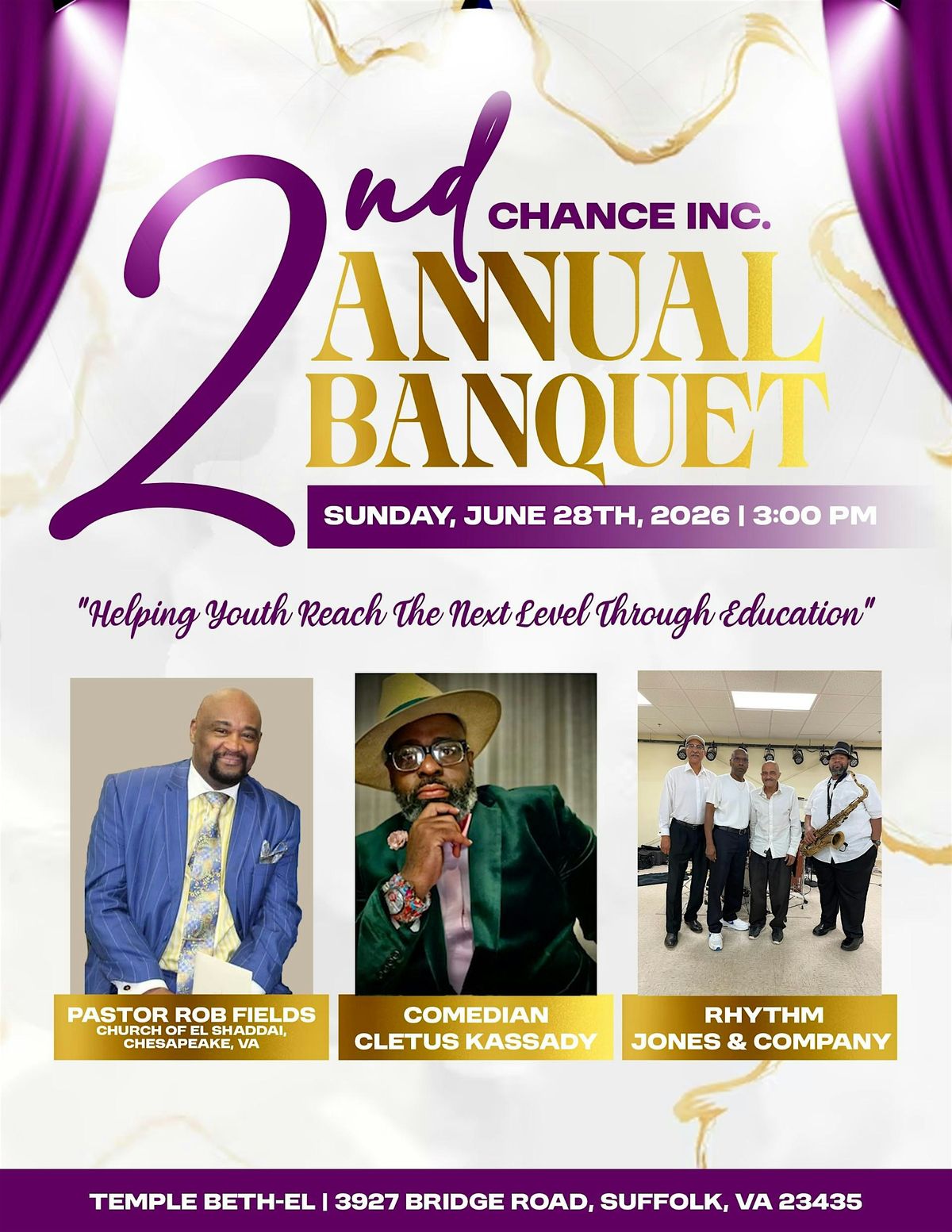 On behalf of 2nd Chance, Inc., we are pleased to invite you to support our Annual Banquet, which will be held on June 28, 2026, at 3:00 P.M. at Temple Beth-El, 3927 Bridge Road, Suffolk, VA. This special event will feature dinner, entertainment, music, an encouraging word, and an inspiring celebration of the lives we’ve impacted together. There will be an honorable recognition of youth that have benefited from the mission of our organization.