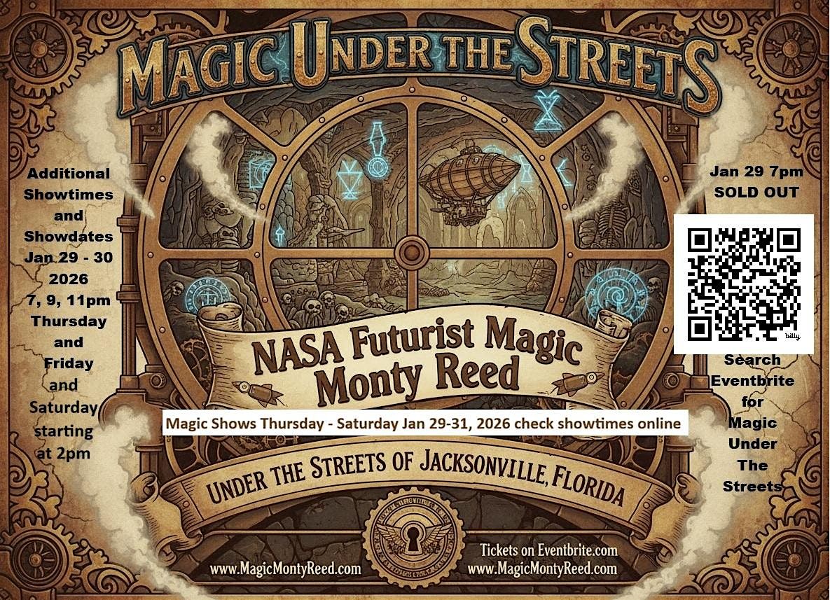 2pm Saturday Show January 31, 2026 Come experience an afternoon of wonder and amazement below Goozlepipe & Guttyworks under the streets of Jacksonville. Join us for a mystical journey into the underground catacombs of Jacksonville, where you'll witness mind-bending illusions and jaw-dropping Magic. Prepare to be amazed as our talented NASA Futurist Magic Monty Reed dazzles you with experiments into the super natural. Don't miss out on this unforgettable evening of Magic and mystery!