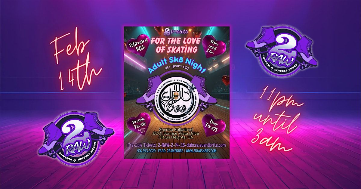 Come join us for a night of skating, music, and fun at Sunrise Rollerland! We are runnin it back with DJ DubCee on February 14th, for the love of skating with 2RAW S8rs. Whether you're a seasoned skater or just starting out, this event is perfect for adults looking to let loose and have a good time with Sk8 Family.