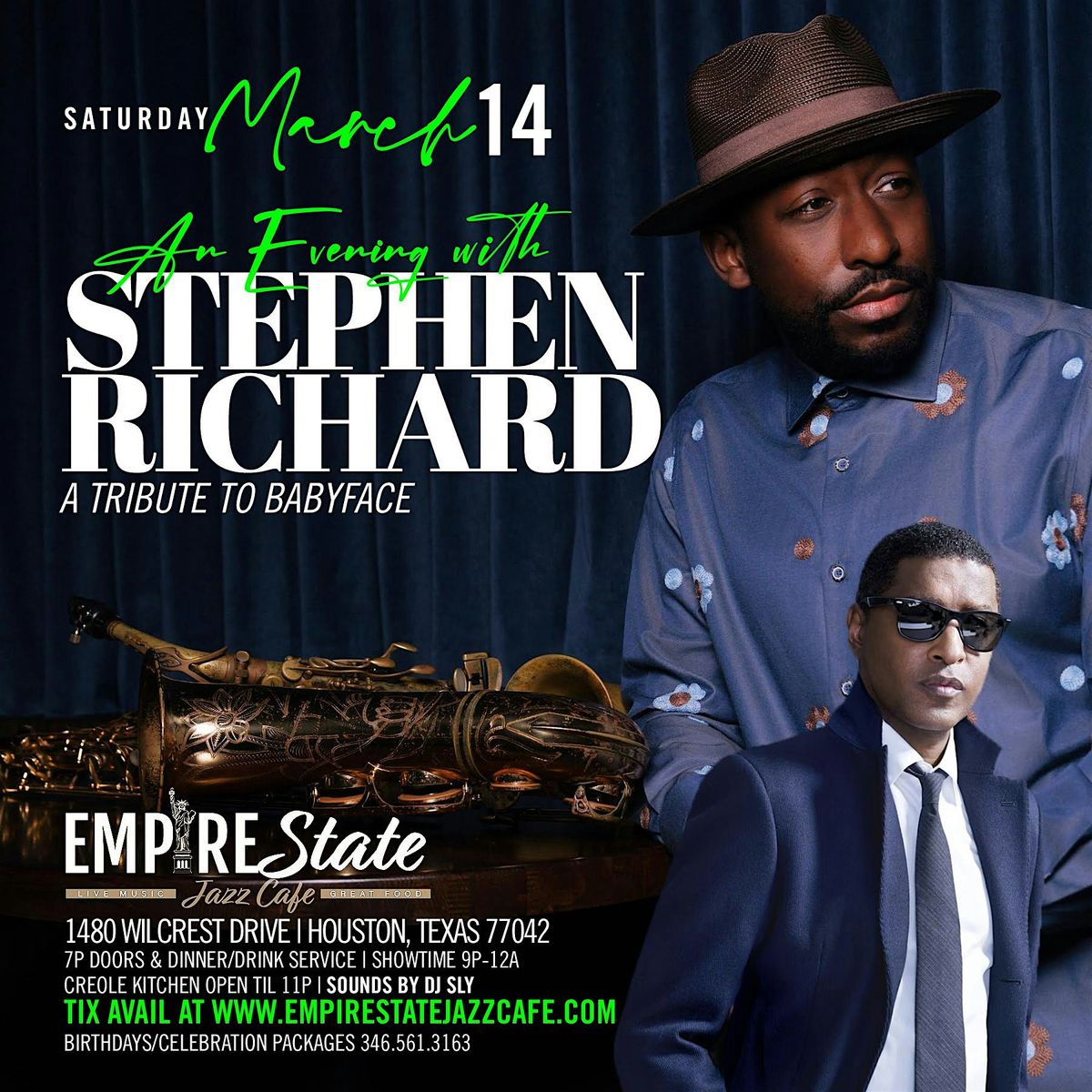 Welcome to the Empire State Jazz Cafe for the 3/14 - Stephen Richard Tribute to Babyface Saturday event! Join us on March 14, 2026 at Doors 7:00 PM | Show 9:00 PM for a night filled with amazing music and good vibes. Let's celebrate the incredible talents of Stephen Richard as he pays tribute to Babyface. Get ready for a memorable evening surrounded by great music and even better company. Don't miss out on this fantastic opportunity to enjoy live music in a cozy setting. Mark your calendars and we'll see you there! (Central Time)