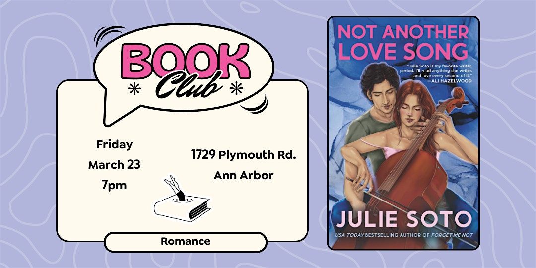 Come join us for a cozy evening at Booksweet for our Romance Book Club on Monday, March 23th! At our last meeting, we selected Not Another Love Song by Julie Soto for our next book. Whether you're an enthusiastic romance fan or just looking for a fun night out with snacks, this event is perfect for anyone who loves a good love story and wants to enjoy some sweet treats!