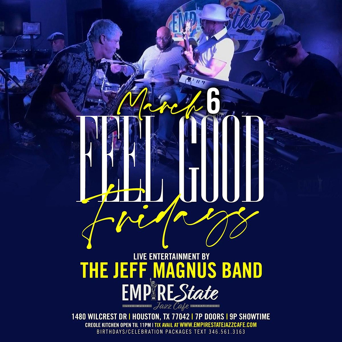 Welcome to the Empire State Jazz Cafe for a night of good vibes with The Jeff Magnus Band! Get ready to unwind and enjoy some soulful tunes on Feel Good Friday, March 6, 2026 at 7:00 PM | Showtime 9:00 PM (Central Time). Let the music transport you to another world as you relax in the cozy atmosphere of our venue. Don't miss out on this opportunity to kick off your weekend with a smile! See you there!