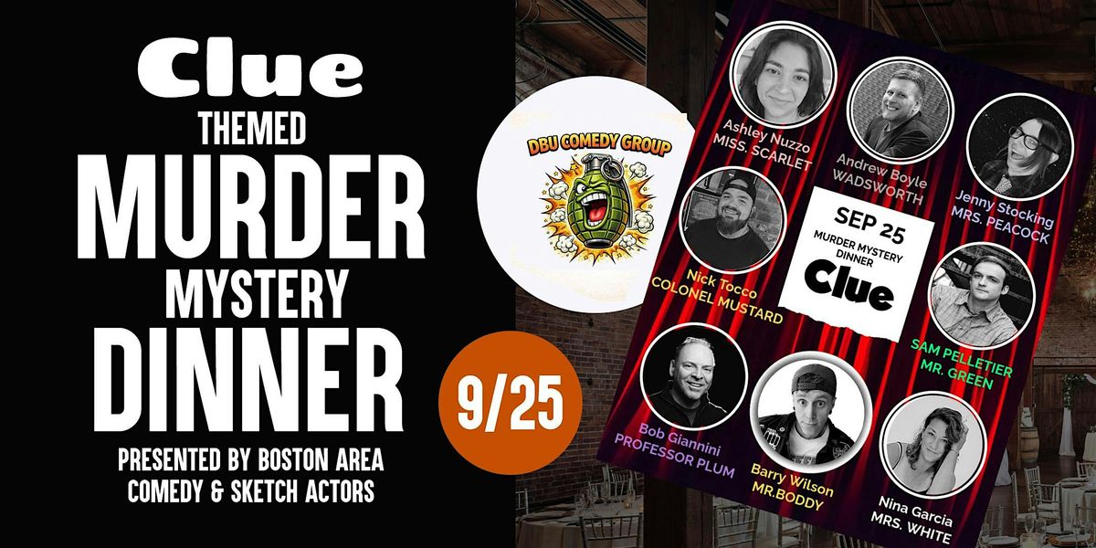 The evening kicks off with a coctail hour featuring a cocktail hour with a complimentary welcome drink and hors d'oeuvres from 6-7 with the dinner and show staring at 7PM. This interactive, Clue Themed M**der Mystery perfromance is put on by DBU Comedy Group, comprised of some of the Boston Areas most talented comedy and sketch performers.