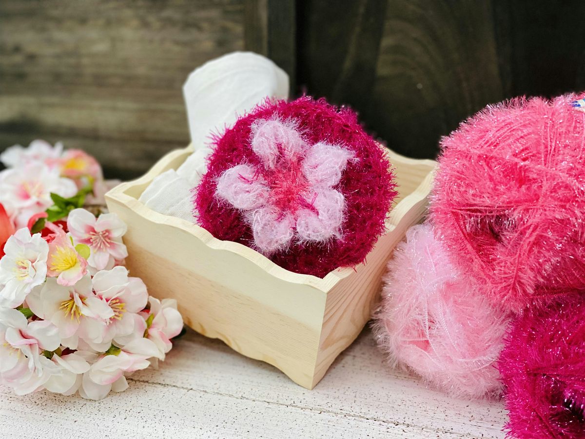 Enjoy the bright beauty of the cherry blossom, or Japanese sakura blossom, in scrubby form!Offered in "studio" presentation (students can choose to progress at their own speed, with minimal direct instruction)using a clever pattern by Astri Elisabeth and the popular basic Filip brand Korean scrubby yarn, Malia will show you how to layer your three pink scrubby yarns to make a three-dimensional flower whose petals are raised off of the body of the scrubby. Pattern will be practiced together with small amounts of acrylic yarn first, then students will move on to working with scrubby yarn. You will leave class understanding how this scrubby project is completed, creating 2 blossom scrubby pieces whose edges are then single crocheted together.