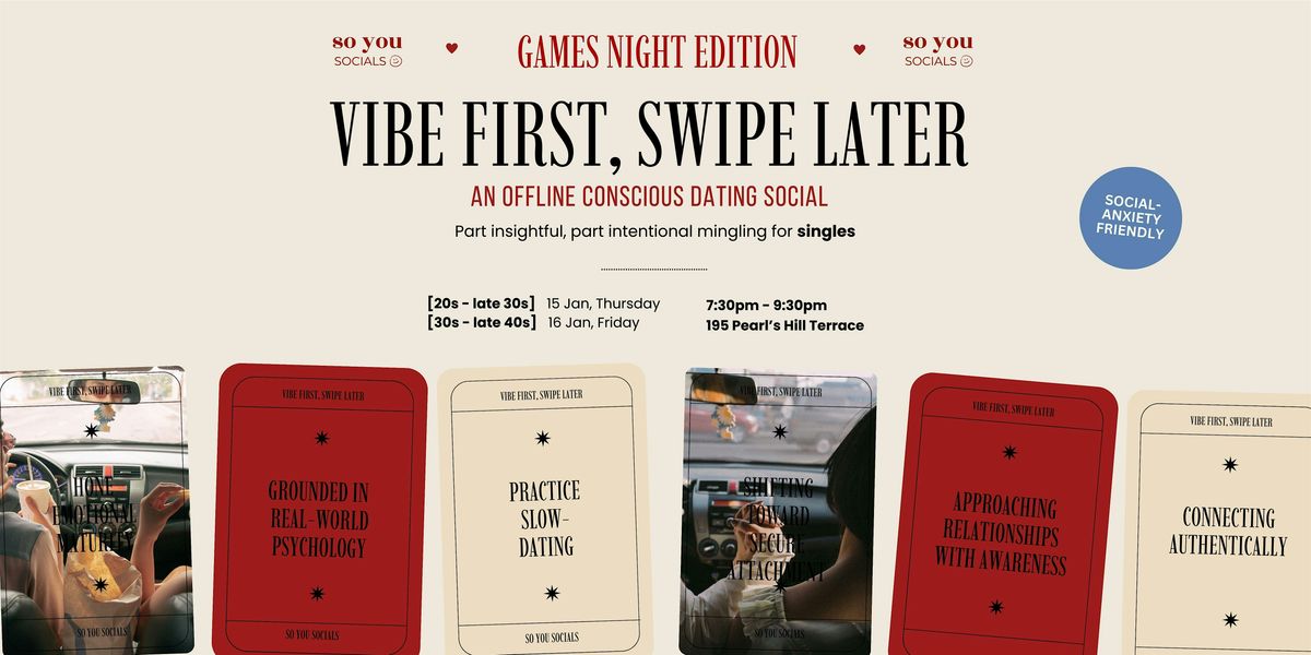 Vibe First, Swipe Later is a conscious dating social — part insightful, part intentional mingling. This event is grounded in attachment theory and real-world psychology.