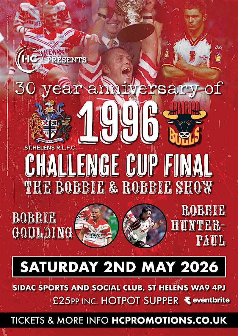 Join us to celebrate the 30 year Anniversary of the unforgettable 1996 Challenge Cup Final! Our guest speakers are the stars of the show that day - Saints Bobbie Goulding & Bradford's Robbie Paul as we take a trip down memory lane reliving one of the greatest finals ever.