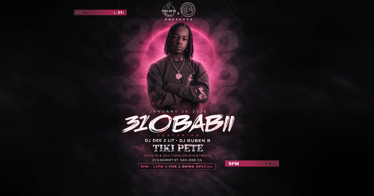 Join us for an electrifying evening with live performance by 310BABII and sounds by DJ Dee2Lit & DJ Ruben R at Tiki Pete! Get ready to experience the best of live music in the heart of San Jose, CA. This in-person event promises an unforgettable night filled with incredible performances and a vibrant atmosphere.