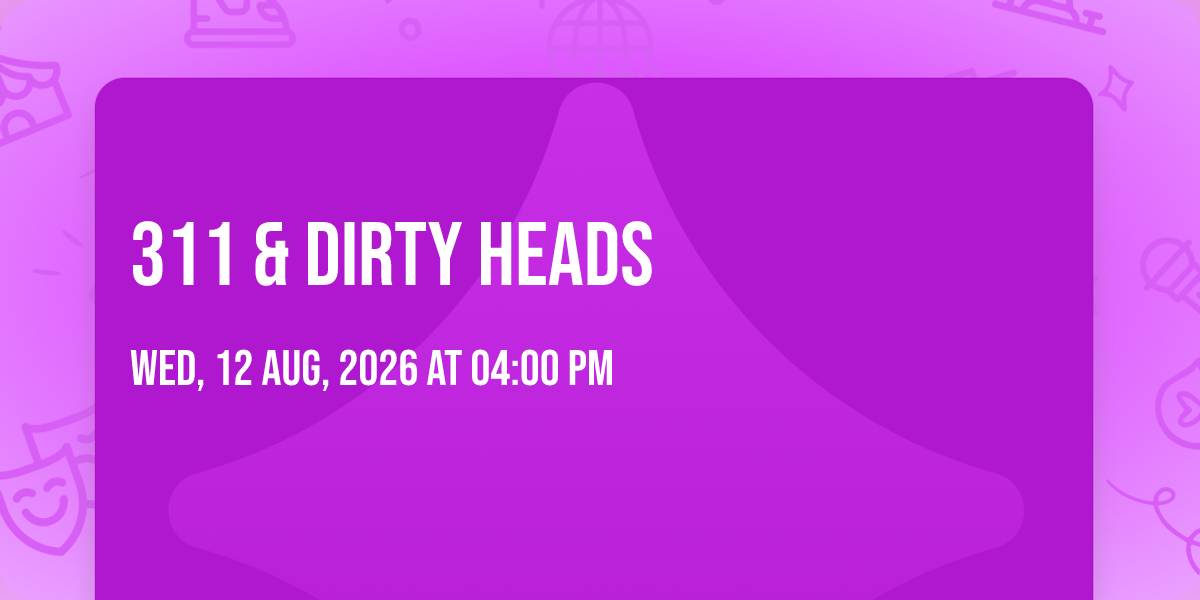 🎉 Welcome to 311 & Dirty Heads, where the impossible becomes possible and dreams take flight! 🏛️ Join us at White River Amphitheatre in the heart of Auburn, WA for an event that will redefine your expectations. 📅 On August 12th, 2026 at 04:00 PM, witness the transformation of space and time into something truly magical. ✨ It's a curated experience combining the best of innovation, entertainment, and community spirit, creating moments that will be remembered for years to come. Whether you're a first-time visitor or a seasoned enthusiast, prepare to be amazed. 🎊 Book now to ensure your place in this unforgettable experience!http://maps.seatics.com/WhiteRiverAmphitheatre_EndstagePitNoRsvdLawn_2026-09-17_2026-01-21_0023_01212026_003341_SVGC_tn.png