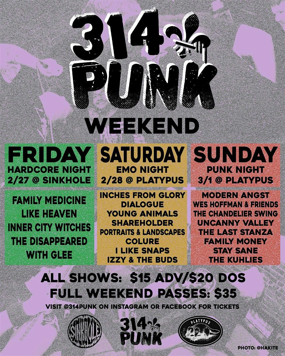 Includes entry to all 3 days of 314 Punk weekend. 2/27 @ Sinkhole, and 2/28 and 3/1 at Platypus.About this Event
