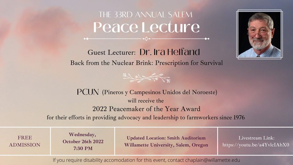 Each year Willamette University hosts the Salem Peace Lecture where a guest lecturer is invited to speak on an issue that is relevant to the peace and well-being of our society today. This year's Salem Peace Lecture will be held on October 26, 2022, in Willamette University's Smith Auditorium. It will also be available to watch as a livestream through the following link:We will be hearing guest lecturer Dr. Ira Helfand speak on the topic: “Back from the Nuclear Brink: Prescription for Survival.” Dr. Helfand is the co-chair of the National Physicians for Social Responsibility’s Nuclear Weapons Abolition Committee, the co-president of International Physicians for the Prevention of Nuclear War (IPPNW) and one of the originators of the Back from the Brink international campaign. With his extensive knowledge on the nuclear weapons issue, we are honored to have him share his insights, as this year’s speaker, on the global consequences of nuclear war.