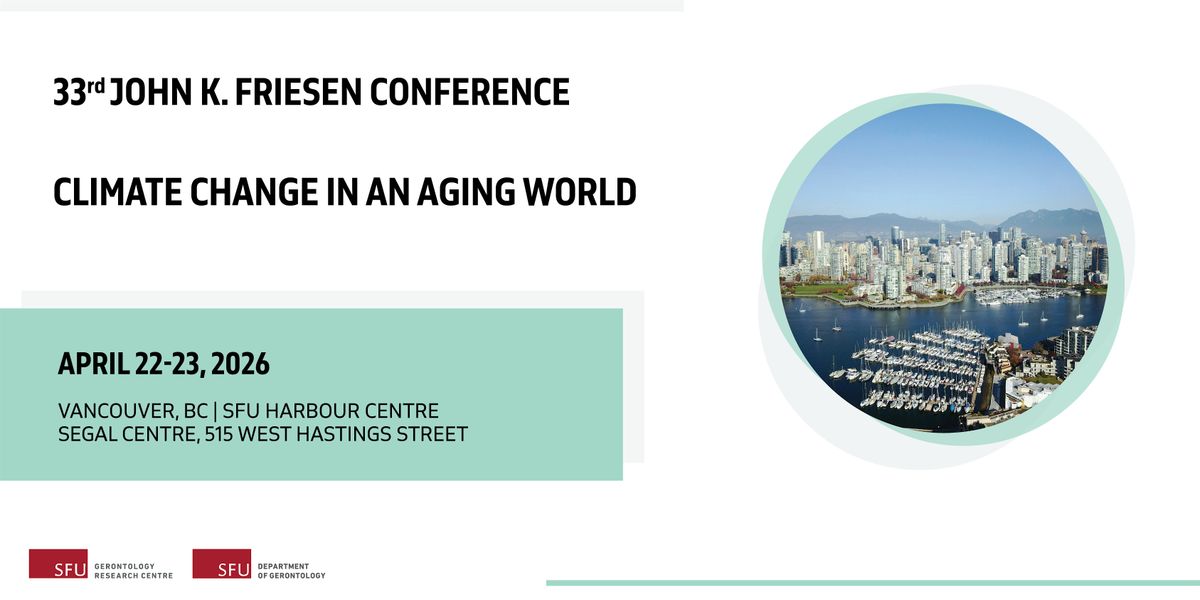 The Simon Fraser University Gerontology Research Centre (GRC) and the associated Department of Gerontology welcome you to the 33rd John K. Friesen Conference entitled “Climate Change in an Aging World.” Climate change and population aging are two intersecting global trends that significantly impact the health and social experiences of older people, healthcare and community/social systems, governments, the private sector, and social justice. The purpose of this conference is to bring together experts from academic, community, NGO, government, and private sectors to review emerging issues and share cutting-edge innovations to identify climate change adversities, and to enhance climate resilience among older adults and their families and communities to overcome these challenges. Highlights include keynote addresses; topical panel discussions, symposia, and poster displays presented by local, national, and international speakers representing community organizations, NGOs, government, and academic sectors.