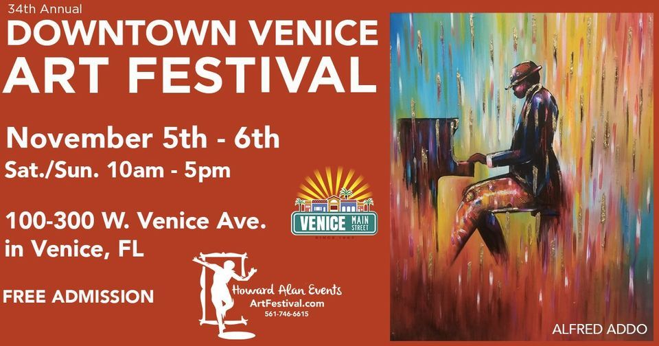 Located on Florida's west coast, Venice is a vibrant town on the Gulf of Mexico, filled with historic charm, natural beauty, and independently owned shops and restaurants. Considered one of the best kept secrets in all of Florida, the community of Venice has a number of special surprises awaiting you. Whether you like shopping in the unique stores of the downtown Venice Main Street district or prefer golfing, boating, or other recreational activities, Venice has it all. Settled along West Venice Avenue, the Downtown Venice Art Festival adds to the ambiance of this unique town. More than 100 of the nation's most notable artists will exhibit their work, ranging in mediums from photography to jewelry, paintings to sculpture, ceramics, glass, mixed media and more during this weekend community festival. Festival patrons and art collectors alike can meet and visit with their favorite artists, view and purchase original works, or commission custom pieces.