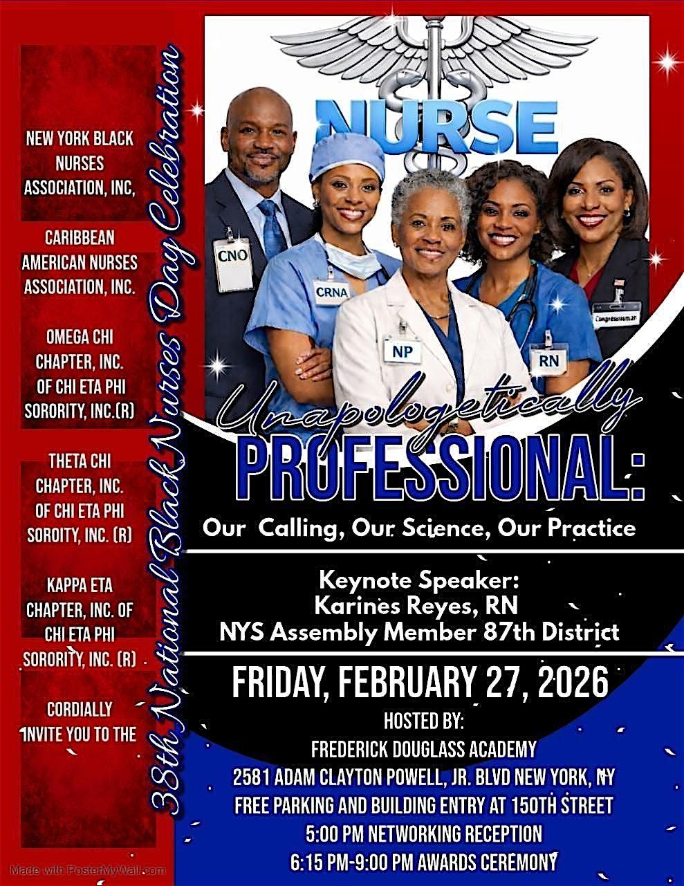 The 38th National Black Nurses Day Celebration is an annual event recognizing the outstanding contributions of nurses in the New York City metropolitan area. The networking reception from 5pm-6pm provides an opprotunity to mix and mingle with student nurses, clinical nurses, and nurse leaders. The program 6pm-9pm includes the rememberance of nurses wo passed since last year and the key note address by NYS Assembly Member Karines Reyes, RN.
