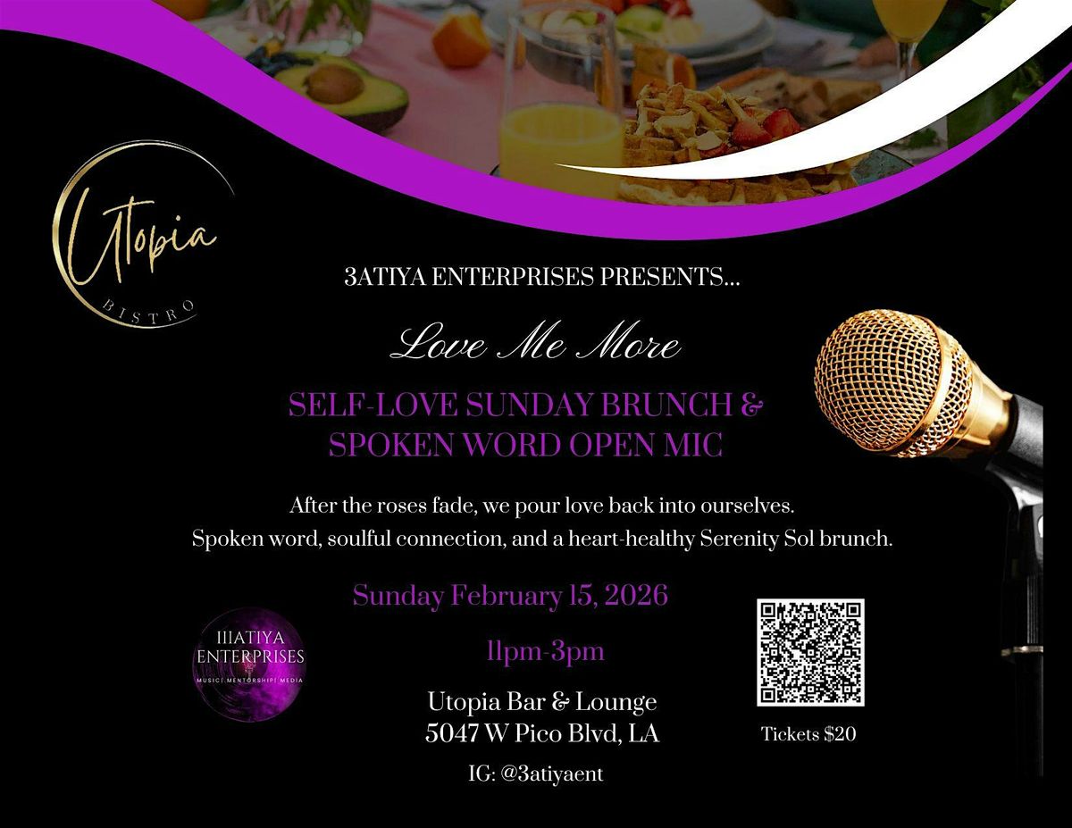 Welcome to 3ATIYA's Love Me More Self-Love Sunday Brunch & Spoken Word Open Mic happening at Utopia Bar and Lounge on February 15, 2026 at 11:00 AM (Pacific Time). Join us for a day filled with self-love vibes, delicious brunch, and inspiring spoken word performances. It's all about celebrating yourself and spreading positivity! Come share your story or simply enjoy the uplifting atmosphere. Let's make this Sunday a memorable one together!