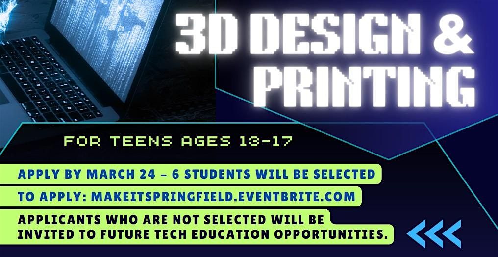 This program is application-based; there are 6 spots. Teens should complete the registration form, including a few short questions about their interests by MARCH 24, 11:59 PM. The class dates are: Tuesdays, April 7-May 12, 4:00-6:00 PM, at Make-It Springfield.