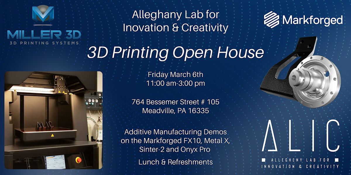 Join Miller 3D for a hands-on 3D Printing Open House at the Allegheny Lab for Innovation & Creativity (ALiC) in Meadville, Pennsylvania. This event is designed for manufacturers, engineers, educators, and industry leaders interested in exploring the latest advancements in additive manufacturing.