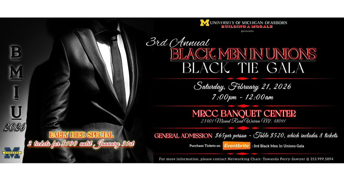 Join us for a night of celebration & networking at our 3rd Annual Black Men In Unions Black Tie Gala 2026!! The event will take place on Saturday, Feb 21, 2026 at the MRCC Banquet Center.