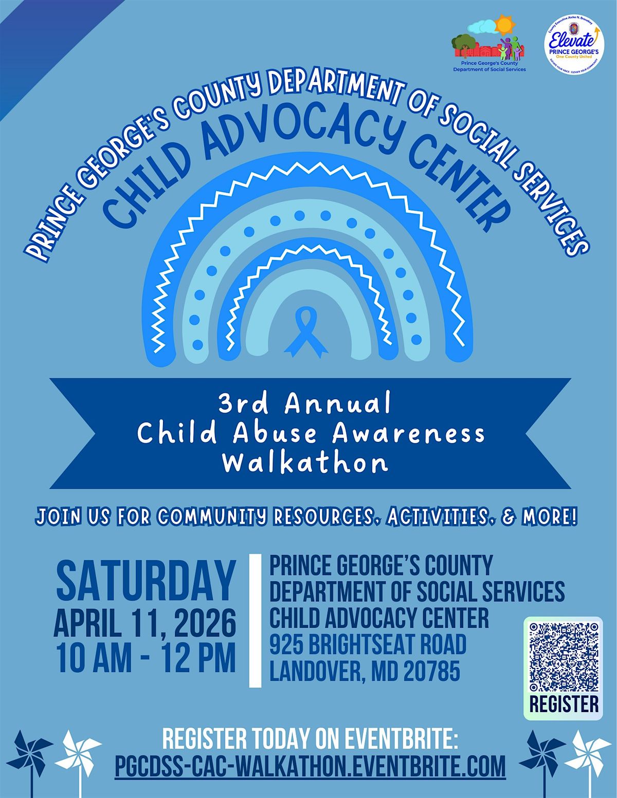 The Prince George's County Department of Social Services (PGCDSS) Child Advocacy Center (CAC) invites you to our 3rd Annual Child Abuse Awareness Walk-a-thon at 925 Brightseat Road, Landover MD 20785! Lace up your sneakers and join PGCDSS employees and other supporters taking a stand against child abuse and walking towards a brighter future for all children in Prince George's County.