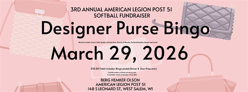 Join the Berg Hemker Olson American Legion for our 3rd Annual Designer Purse Bingo. All funds raised will go to support the American Legion Post 51 Girls Softball Program which will be in it's fourth year.