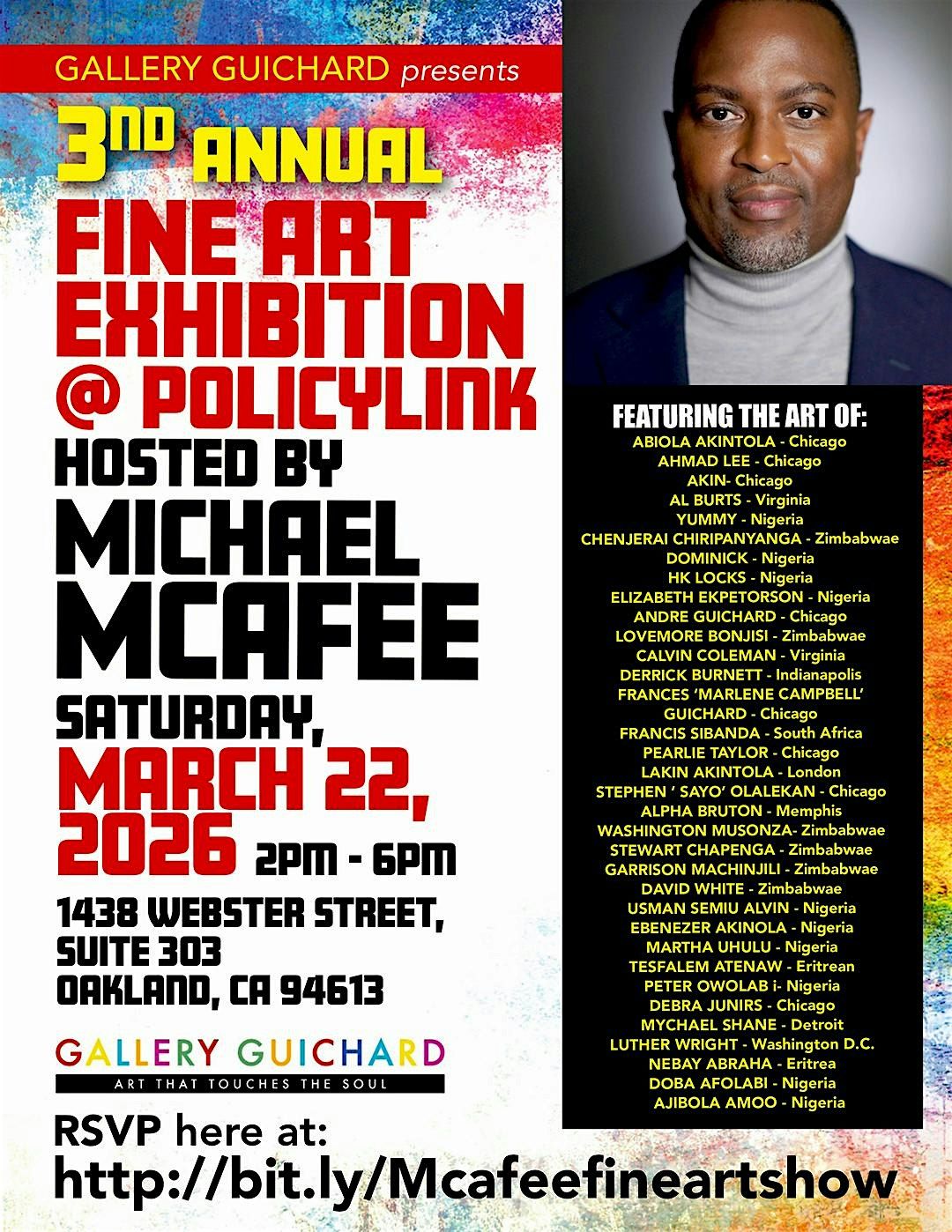Welcome art enthusiasts! 🎨 Join Gallery Guichard Fine Art Gallery from Chicago, IL. for the 3rd Annual Fine Art Exhibition hosted by Michael McAfee at PolicyLink.