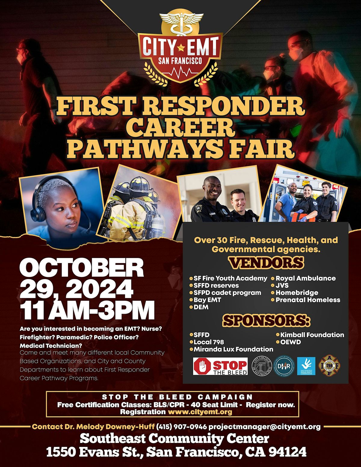 Welcome to the First Responder Career Pathways Fair! Join us at the Southeast Community Center for an exciting event where you can explore various career opportunities in the field of first response. Whether you're interested in becoming a paramedic, firefighter, police officer, or emergency medical technician, this fair is the perfect place to learn more about different career pathways. Network with professionals, attend informative workshops, and discover the possibilities for your future in first response. Don't miss out on this valuable opportunity to kickstart your career!