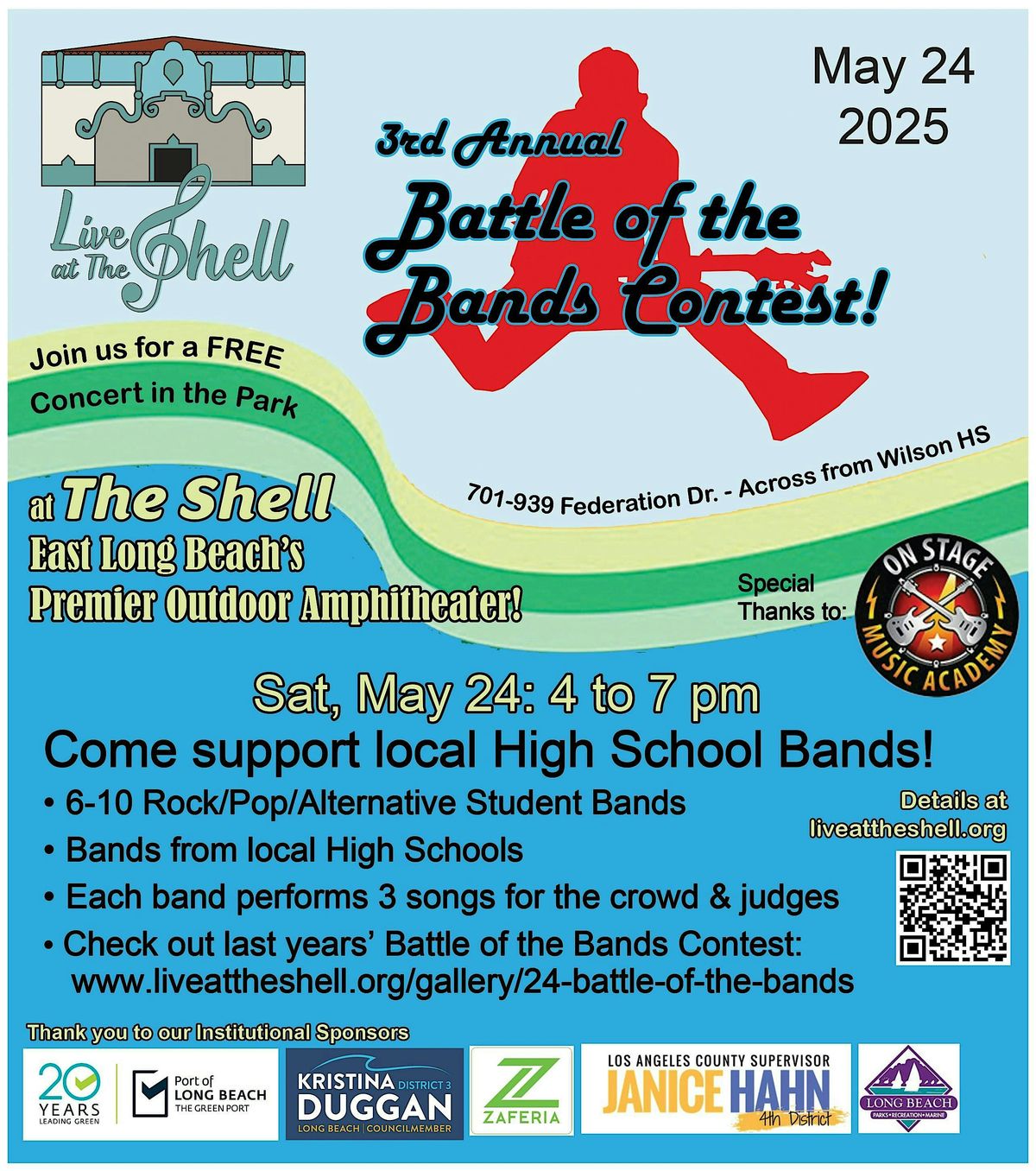 Welcome to the 3rd Annual Long Beach High School Battle of the Bands Contest! Get ready for an evening of electrifying performances by talented high school bands. Join us for a free, fun-filled evening of live music and support the local high school music scene. Bands are from all over Long Beach. This event is co-sponsored by On Stage Music Academy.