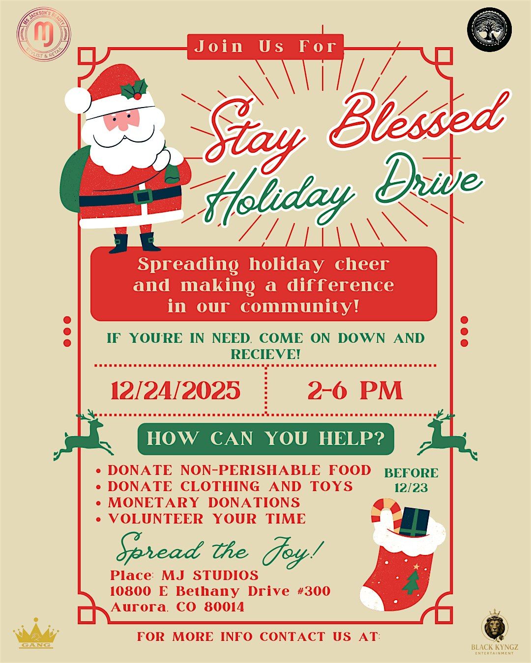 Come join us for the 3rd Annual Stay Blessed Drive at 10800 E Bethany Dr on December 24, 2025 at 2:00 PM (Mountain Time). Let's spread joy and blessings to those in need this holiday season. Bring your friends and family to a day of giving back and making a difference in our community. See you there!